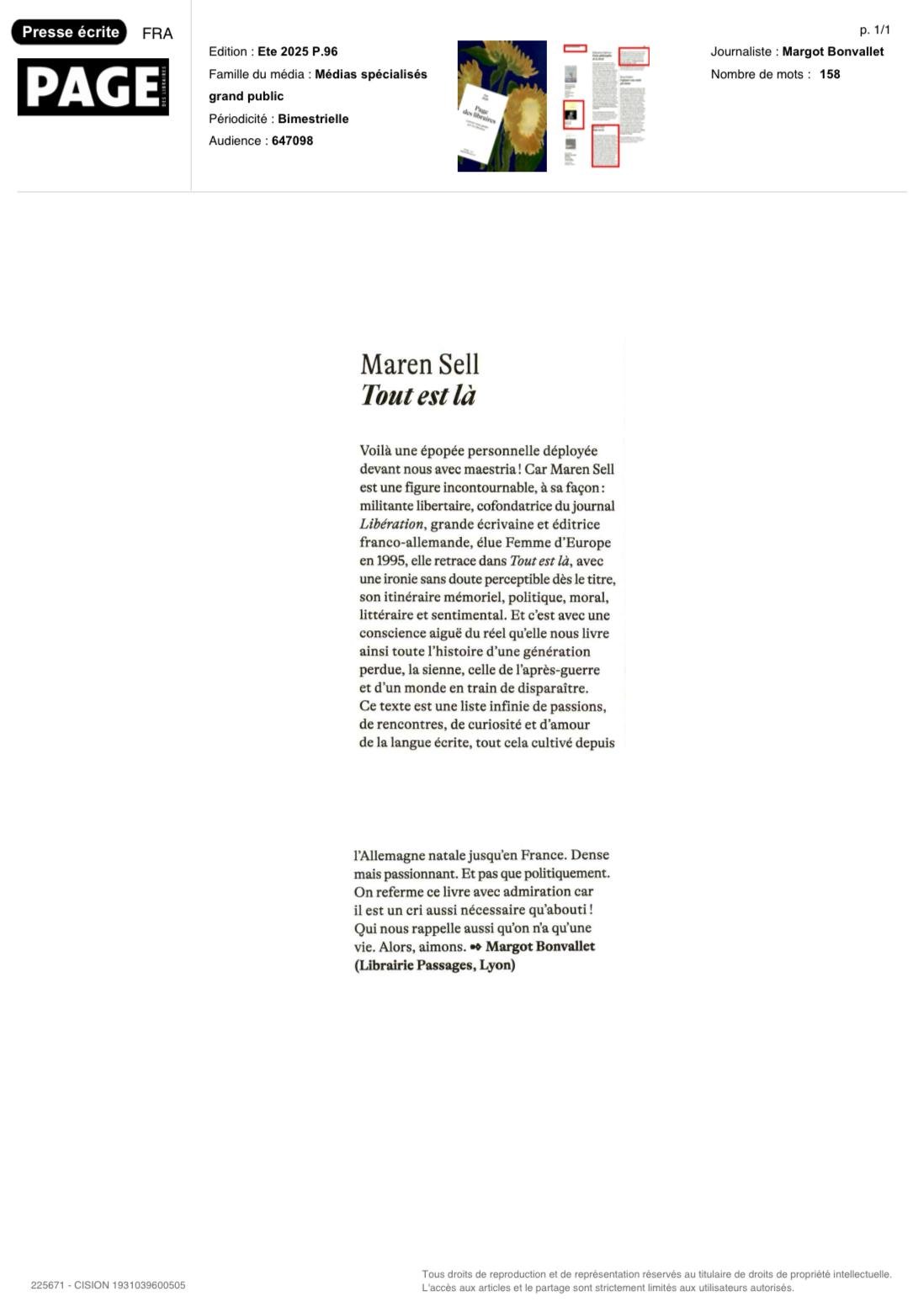 " Je connais la date et le lieu exacts de ma conception. Février 1945 moins neuf mois. Mes parents habitaient à quelques kilomètres d'Auschwitz. De leur balcon, ils voyaient passer le cortège des déportés vers les chambres à gaz. Le soir, ils faisaient l'amour et donnèrent naissance à un deuxième enfant. Le crime m'a fait venir au monde. J'ai le grand âge des grands crimes. " Le père ne fut ni un héros résistant ni un viril soldat SS, mais un père aimant qui a transmis à sa fille sa passion pour la musique et pour la France. La mère une bonne et blonde allemande dont la zone d'intérêt fut de remplacer la choucroute par des produits bio et de s'aveugler quand l'oncle Fred libidineux s'en prend à sa fille. La soeur, Ingrid, traverse l'Atlantique au bras d'un officier américain : chacun à sa façon fuit les ruines du III Reich. Dans la cave de ses parents, la petite fille de 6 ans découvre un album. Sur une des photos, un groupe d'hommes en uniforme extirpe un foetus du ventre d'une femme à l'agonie. Est- ce ainsi que font les hommes quand ils ont le pouvoir de le faire ? Après les années d'initiation où se tresse le canevas sentimental et politique, Maren passe la frontière pour rejoindre Paris. Mai 68, l'utopie révolutionnaire, le bouillonnement de l'université de Vincennes, l'engagement dans la Gauche Prolétarienne, l'amour libre : elle restitue ici le parfum et les figures des années 70 où l'on " chantait rouge " ... avant les années de plomb. Parmi les clandestins qu'elle héberge à Paris dans l'appartement qu'elle partage avec son amant Marcel Bouguereau : Gundrun Ensslin et Andreas Baader... As-tu tué? lui demanderont ses petits-enfants. Non, pour des raisons très précises dont elle s'explique ici. Avec Sartre, July et les autres, elle est co-fondatrice du journal Libération où elle impose une page " Femmes " . Avec André Glucksmann, des années de merveilleuse complicité et de voyages. Et voilà que la " passeuse " entre l'Allemagne et la France (qui sera couronnée " Femme d'Europe en 1995) se fait éditrice : Lieu commun en 1980, la création des Editions Maren Sell et de sa " Petite bibliothèque européenne " en 1986 plus tard accueillie par Calmann-Lévy, la direction des Editions Pauvert, etc. " Au fond, j'ai toujours triché avec la Révolution " avoue cette femme qui ne cesse d'affirmer sa liberté individuelle contre les diktats collectifs : elle fut féministe militante mais n'a cessé d'aimer les hommes ; gauchiste mais s'est mariée à un grand patron de droite qui sera l'homme de sa vie et dont elle découvrira après son AVC les compartiments secrets ; maoïste mais devenue bouddhiste qui part en Inde soigner son mari puis ses propres blessures ; introductrice en France des plus grands écrivains européens mais aussi de Christine Deviers-Joncourt et de Loana ; ayant souffert de sa famille mais se retrouvant sur le tard reine mère d'une ruche où se côtoient enfants adoptés ou non, petits-enfants nombreux, abeilles du monde qui vient auxquelles elle laisse ce livre en forme de viatique et de testament. " Ma vie n'a été rien d'autre que d'affirmer ma fidélité à ceux qui chantaient à mes oreilles la présence du divin dans la beauté enchantée par une forme " .